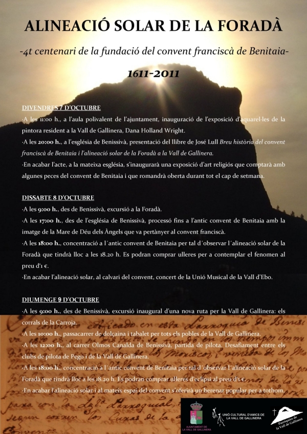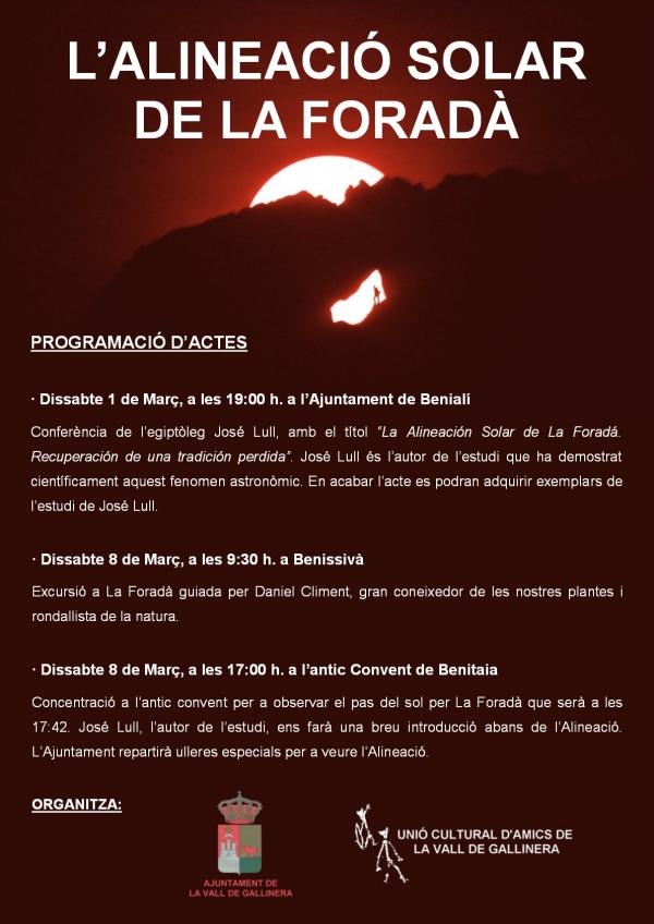 Conscients de la importància que aquest fenomen podia tindre per a revitalitzar el turisme a la Vall de Gallinera, la Unió Cultural va recolzar des del primer moment l'esdeveniment, participant activament en la seua organització i fent-se càrrec de les excursions culturals que s'organitzen cada cap de setmana en què la llum del Sol travessa la Foradà i enllumena les restes de l'antic convent de Benitaia.