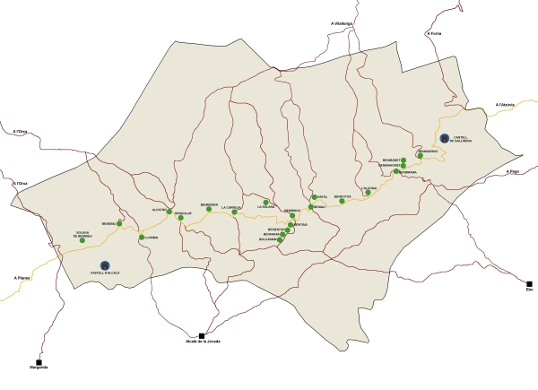 Les 21 alqueries medievals de la Vall de Gallinera i xarxa viària que les comunicava amb les poblacions veïnes. Mapa cortesia de La Vall de Gallinera, per camins de moriscos i mallorquins.