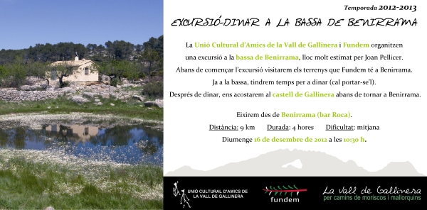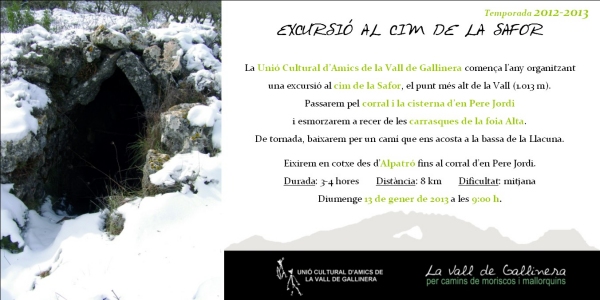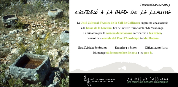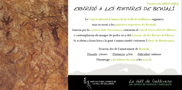 Per a donar a conéixer el patrimoni natural i històric de la Vall de Gallinera, la UCAVG organitza diverses excursions que ens acosten als racons de major interés del territori. Les excursions triades són, principalment, les rutes que apareixen al llibre La Vall de Gallinera, per camins de moriscos i mallorquins, encara que també n'hi ha d'altres que intenten recuperar camins o paratges oblidats.