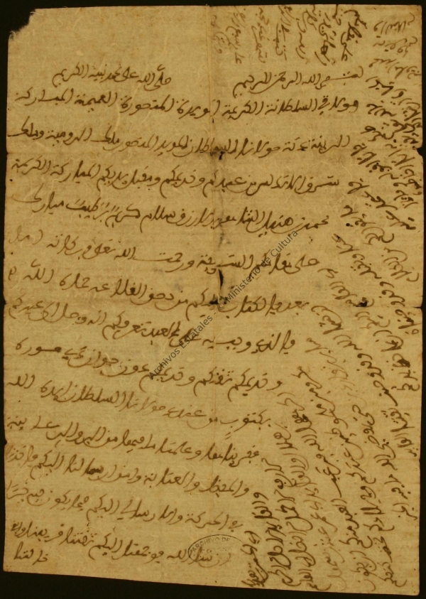 A mi señora la sultana, honorable, apoyada por Dios, victoriosa, universal, bendita, la Reina, esposa de nuestro Señor el Sultán, el apoyado por Dios, vencedor, rey de los cristianos y del Sharq al-Andalus. Vuestro siervo y sirviente, que besa vuestras benditas y honradas manos, Muhammad ibn Hudayl, conocido por Al-Azraq. Un saludo noble, sincero, bueno y bendito a vuestra noble majestad. La bendición de Dios, ensalzado sea, y su misericordia sea con Vos.